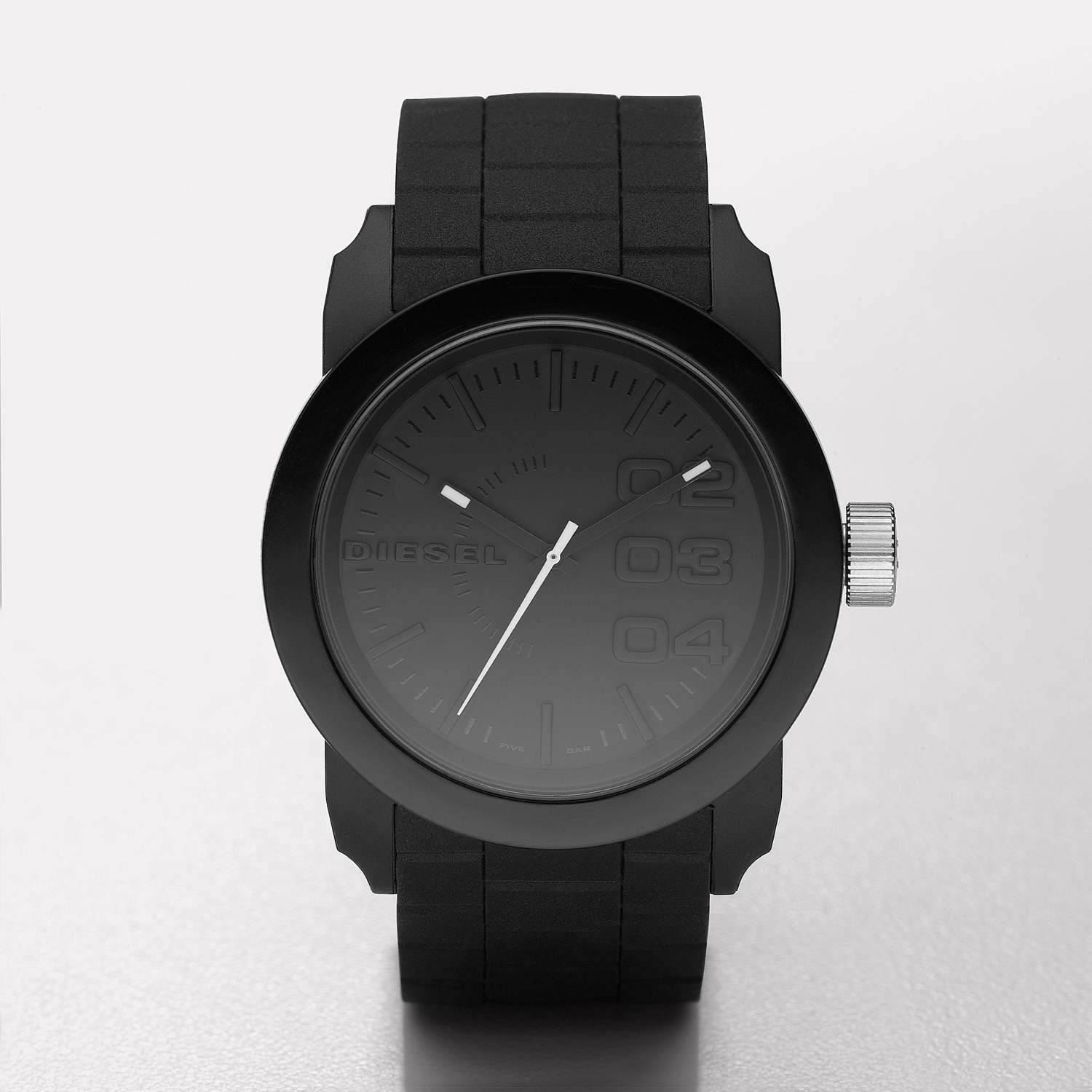 Black silicone strap with fixed plastic bezel. Black dial with black hour markers and three luminous hands. Enlarged Arabic numerals at 2 3 and 4 positions. Black Diesel logo at 9 position. Stainless steel case with "Only The Brave" inscription and logo. Minute markers along outer rim. Mineral crystal window. Traditional buckle closure. Case thickness: 11mm. Case size: 44mm. Water resistant to 30 M.