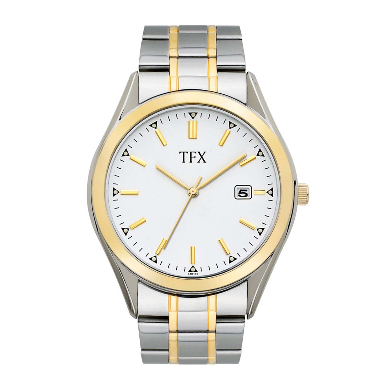 This TFX watch is simple yet sophisticated for day to night styles. Two tone gold and silver stainless steel bracelet. White glossy dial with gold stick hour markers. Mineral glass crystal. Hour minute and second hands. Day display at the 3-hour mark. Water resistant up to 30 meters. Case size: 39mm.