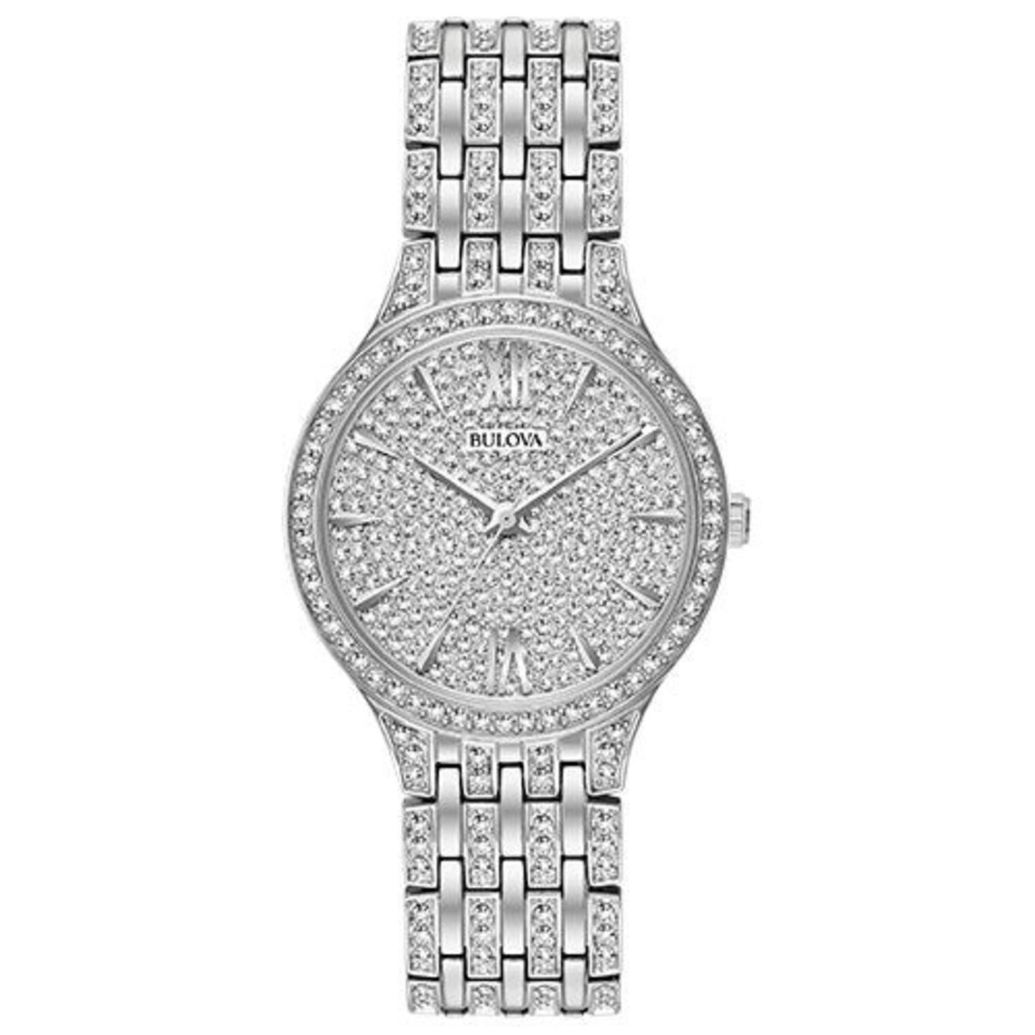 This Crystal Collection watch includes 440 Swarovski crystals. Stainless steel bracelet embellished with Swarovski crystals. Fully paved Swarovski crystal dial with silver-tone hour markers and Roman numerals. Stainless steel bezel fully paved with Swarovski crystals. Silver-tone hour minute and seconds hands. Quartz movement. Mineral crystal dial window. Fold-over deployant closure. Case diameter: 32mm. Case thickness: 6.9mm. Water resistant to 30 M. 3-Year manufacturer limited warranty.