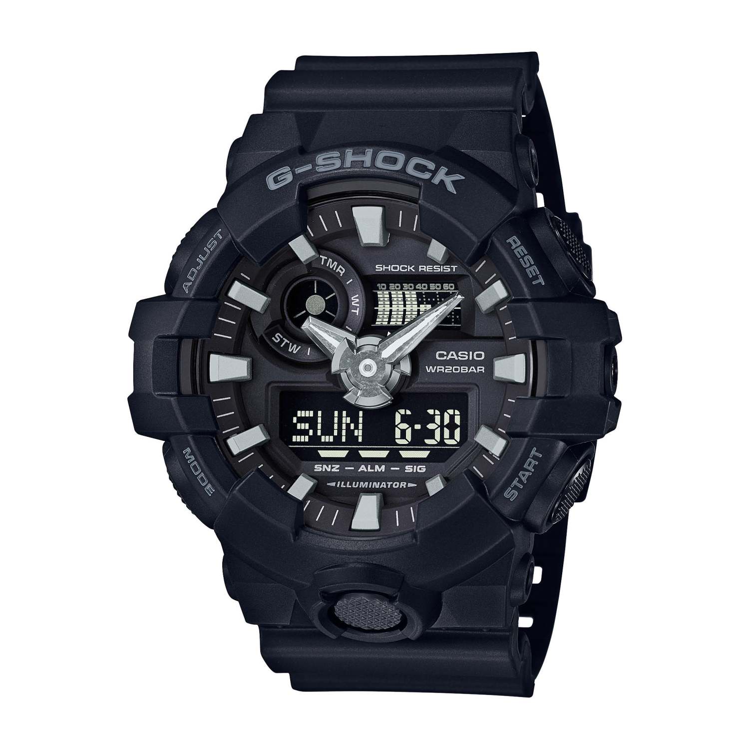 Bold silhouette with 3D dial and multi-dimensional metal look. Shock resistant. LED Light - illumination duration 1.5 or 3 seconds and afterglow. World time - 31 time zones 48 cities. Daylight saving on/off. 1/100-Second stopwatch. Countdown timer. 5 Daily alarms with 1 snooze alarm. Hourly time signal. Full auto-calendar up to 2099. 12/24 Hour format. Button operation tone on/off. Black resin band with mineral glass dial. Water resistant up to 200 M. Case size: 57.5 x 53.4 x 18.4mm. Approx battery life up to 5 years.
