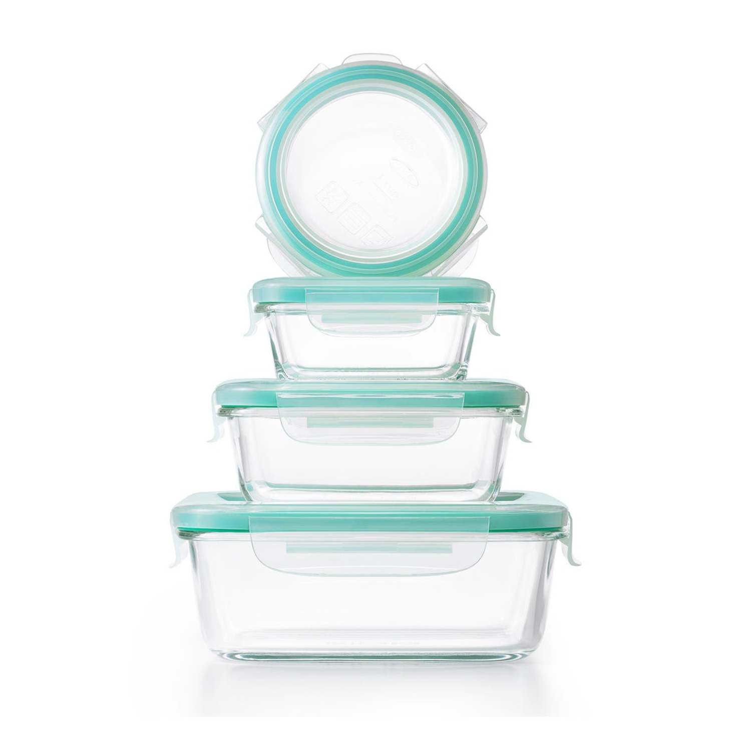 Store all your food and liquids without worrying about leaking. Removable leakproof silicone seal. Locking tabs keep lid securely in place. Freezer safe. Microwave safe. BPA Free. Two 4oz/118ml glass containers with plastic lids. Two 8oz/240ml glass containers with plastic lids. 12.8oz/380ml Glass container with plastic lid. 28oz/0.8L Glass container with plastic lid.