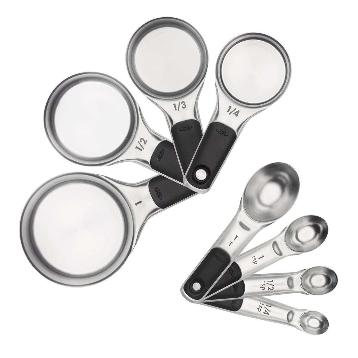Measure ingredients with precision with this Good Grips measuring spoon and cup set. Unique magnetic feature lets you remove one cup or one spoon at a time. Magnetic design also keeps the cups and spoons stacked neatly.. Designed to make leveling ingredients easy and with greater accuracy. Hands are soft and non-slip. Etched markings for easy identification. Spoon set: 1/4 Teaspoon. 1/2 Teaspoon. 1 Teaspoon. 1 Tablespoon. Cup set: 1/4 Cup. 1/3 Cup. 1/2 Cup. 1 Cup.