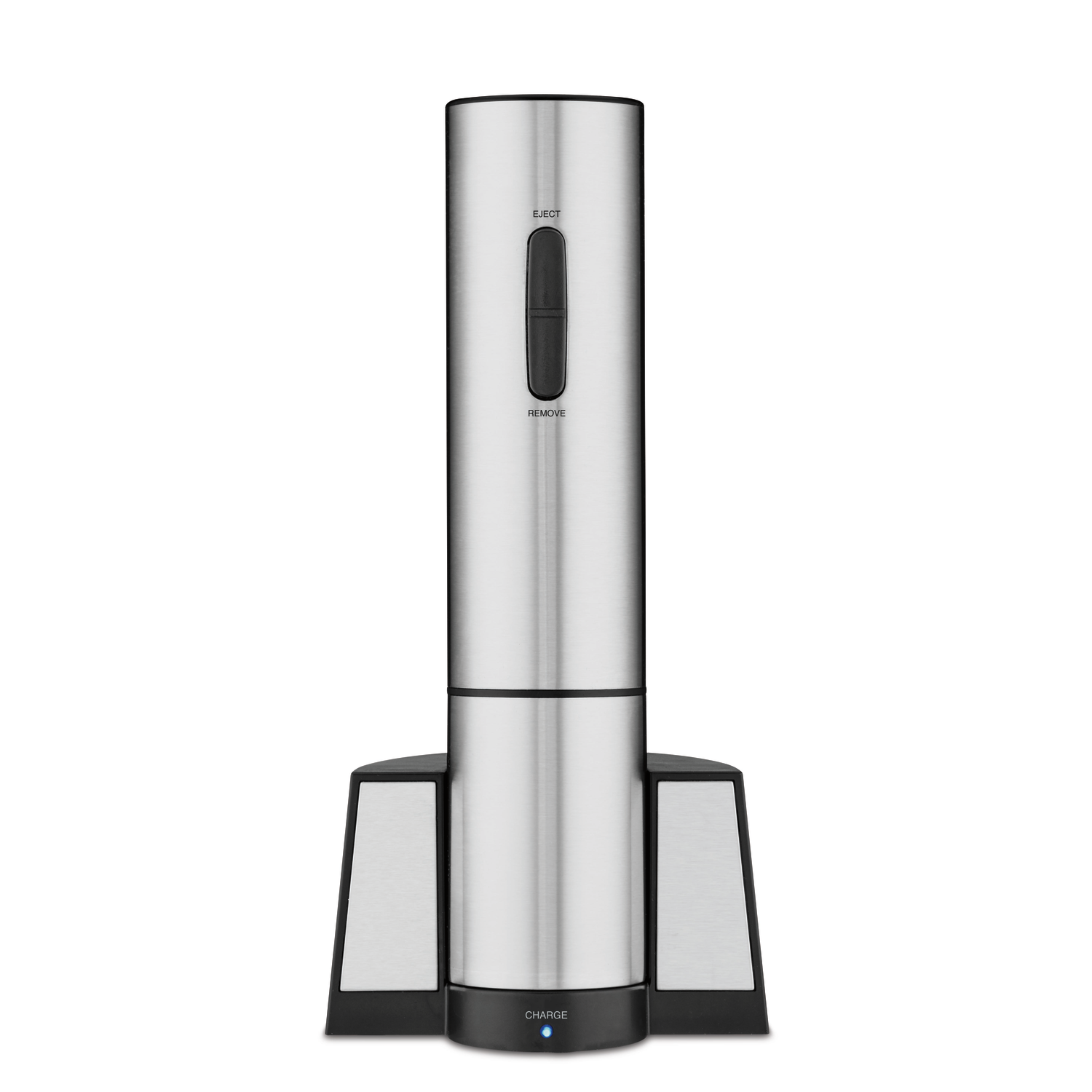 This cordless wine opener removes up to 50 corks on one full charge. Just place on the wine bottle and corkscrew and with the touch of a button, it automatically removes the cork. Equipped with a NiMH battery pack and charging base, it includes a foil cutter and is lightweight.