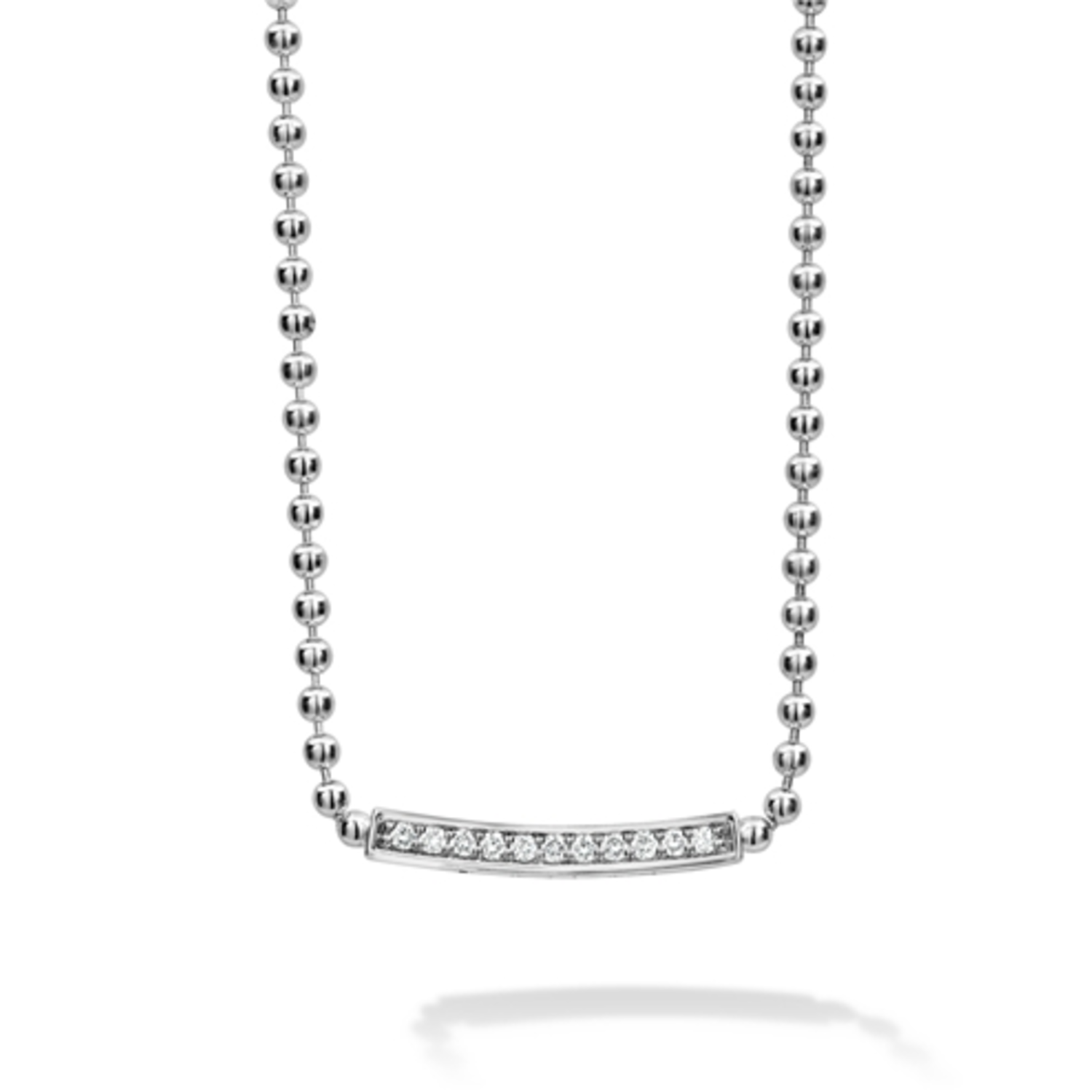 A diamond station set by sterling silver Caviar beading forms this necklace. LAGOS diamonds are the highest quality natural stones weighing 0.28 Carat. Secures with a signature lobster clasp. The ball chain has a width of 2.5mm and can be adjusted for a 16" to 18" length.