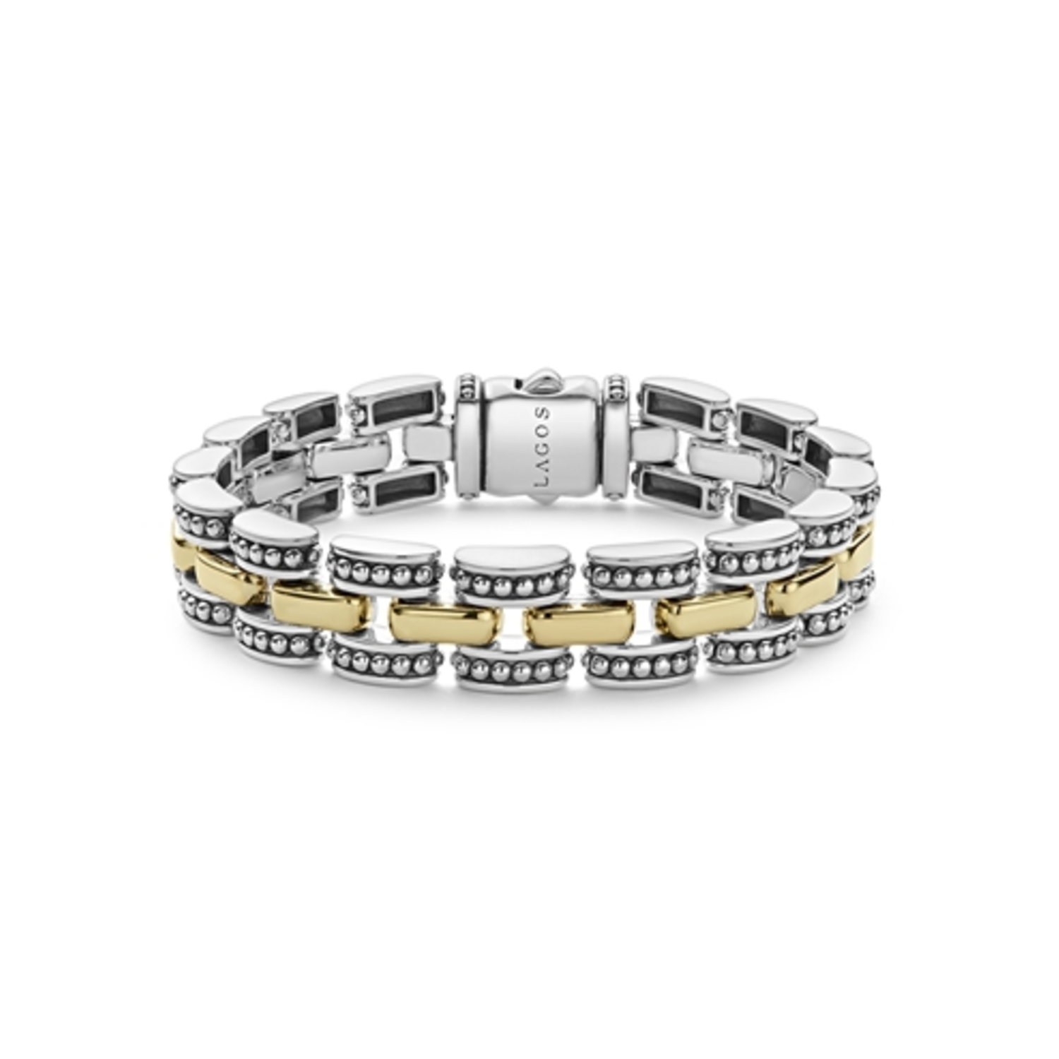 From the High Bar collection, 18K gold and sterling silver Caviar beading forms this link bracelet. Secures with a double button box clasp. Width: 12mm.