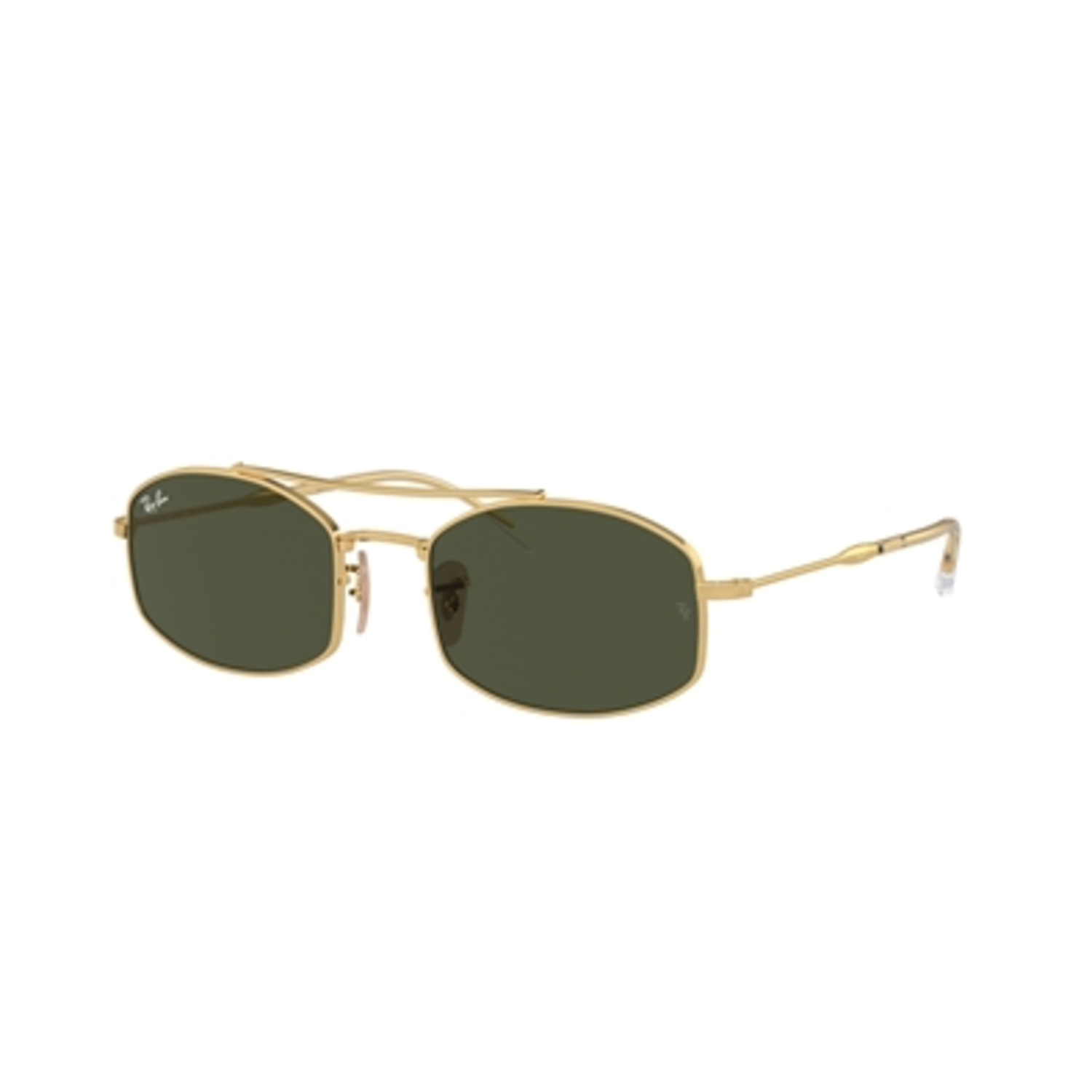 Charged with personality and style, this narrow double-bridge design takes cues from vintage silhouettes. Time-honored design details advance a radical outlook, accenting a slim wire frame with a thick front profile and engraved archive temple from 1996. A unisex double-bridge model with a thicker front profile and archive temple featuring the Ray-Ban logo. Discover classic metal colorways with a gold frame and dark green lenses.