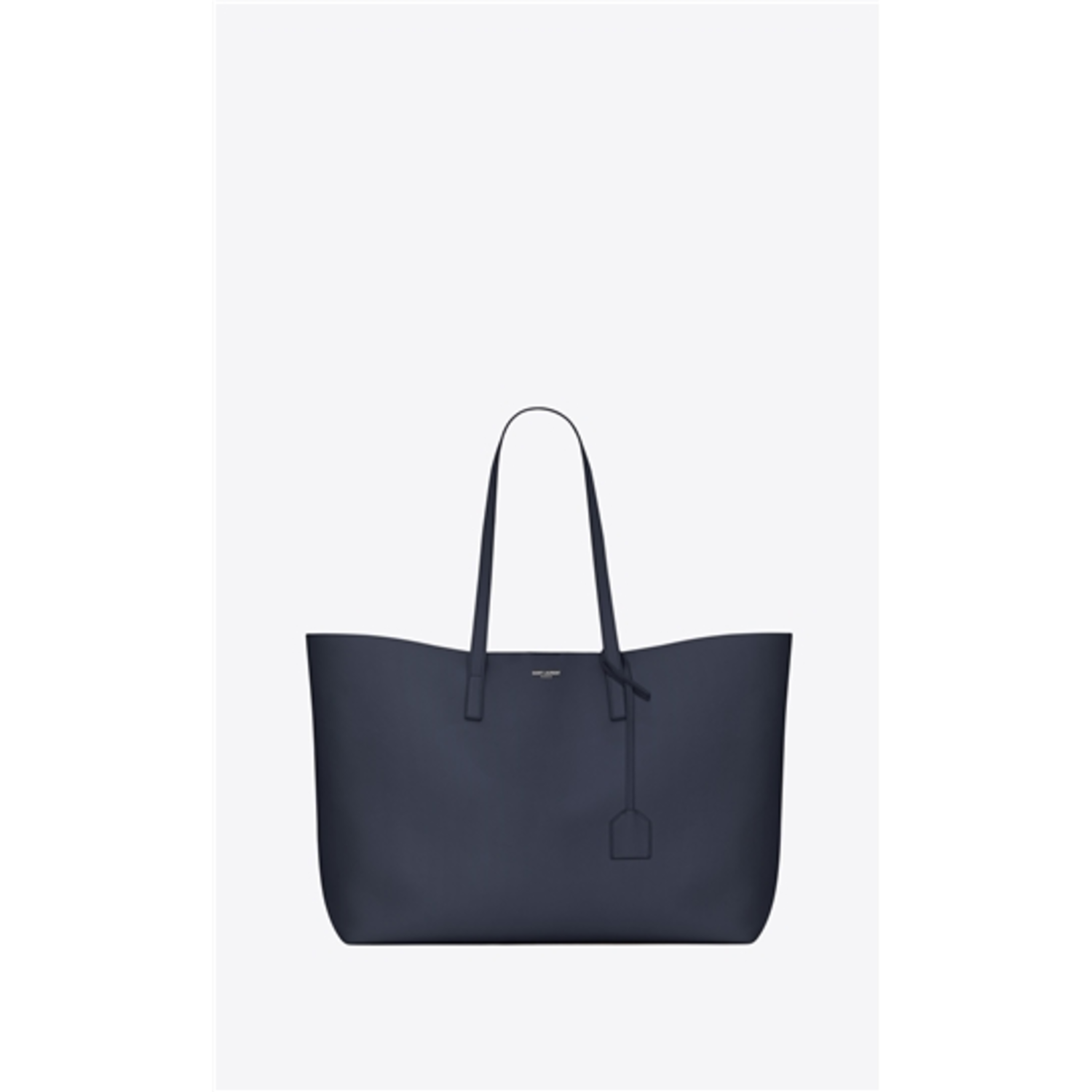 This made in Italy Saint Laurent calfskin tote bag includes a magnetic snap closure with gold toned hardware and a handle drop of 9.3 inches. Attached to the bag is the removable metal charm and removeable zip pouch. This casual style bag built for both genders comes in navy color.