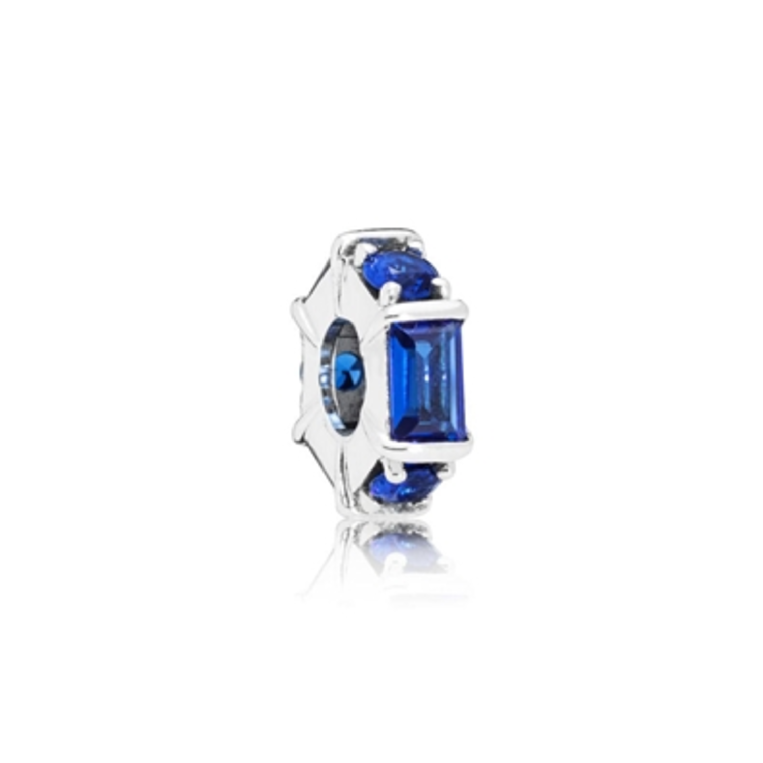 Sea Blue crystals in alternating shapes- faceted baguette-cut and round brilliant-cut. Are set in sterling silver on geometric inspired spacer.