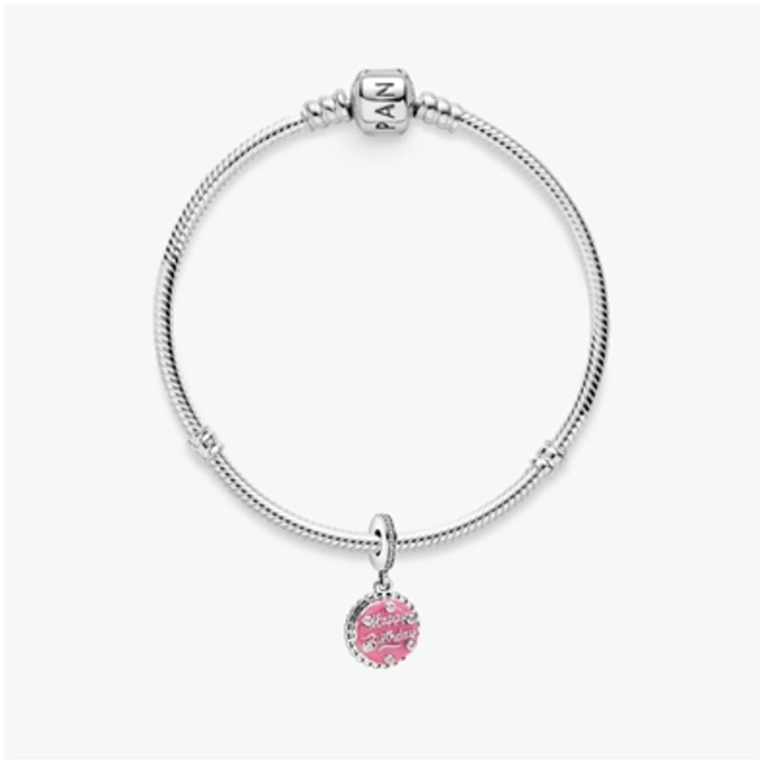 Pandora presents the Let's Celebrate Bracelet featuring one Birthday Cake Pink Dangle Charm. Say “Happy Birthday” with this sterling silver Pink Birthday Cake Dangle Charm. Celebrate the special day with a cake charm that will keep you in festive spirits all year round. The dangle features a hand-applied pink enamel design and clear cubic zirconia dotted around representing candles. The raised “Happy Birthday” script on the front dangle is joined by a candle symbol engraving and the message "Make a wish!" on the back. Make any birthday one to remember with this celebratory charm.