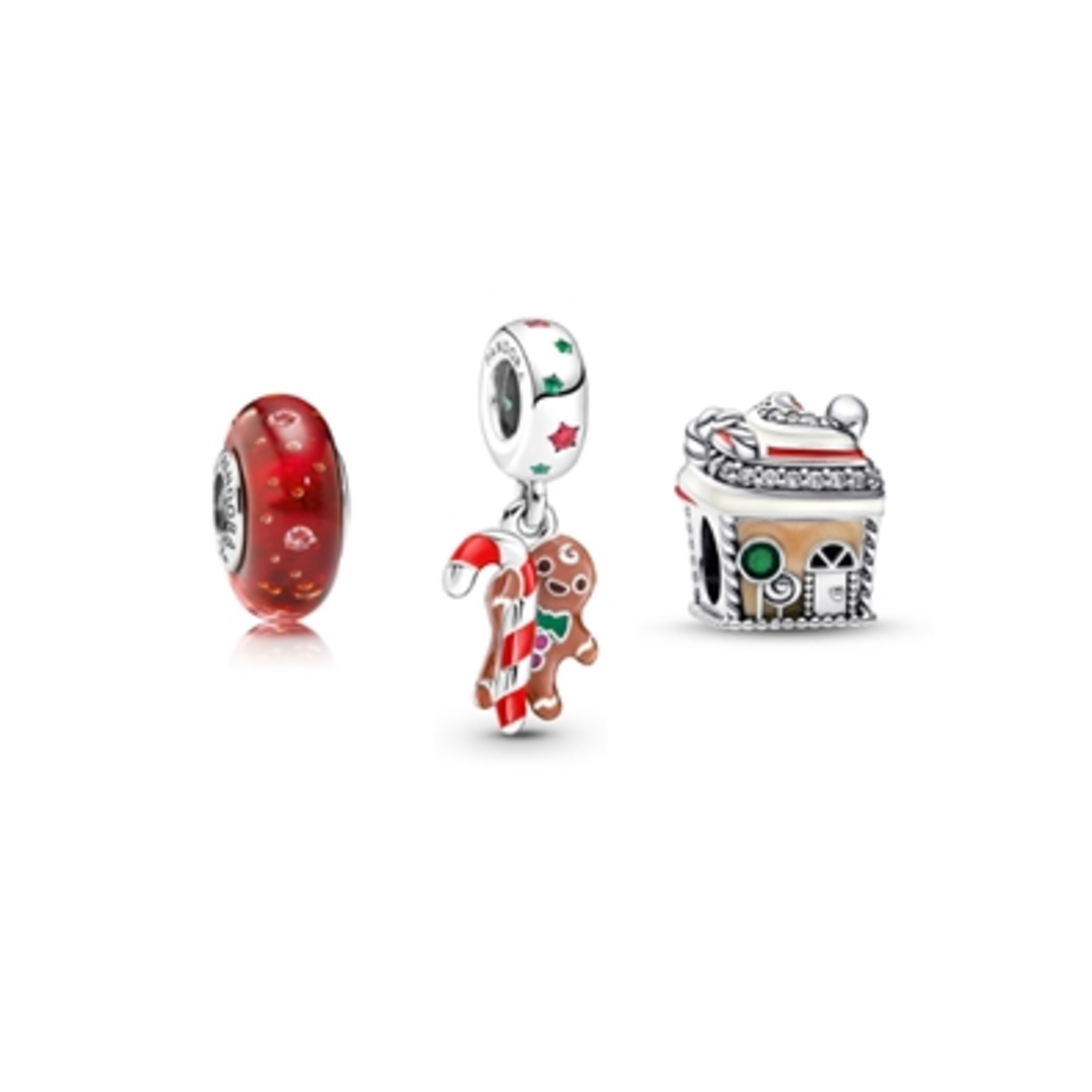 This trio of charms is sweet enough to eat (but please don't). A dangling gingerbread man with enamel detail hides playfully behind a candy cane, paired with a multicolor enamel filled gingerbread house, and a vivid Murano with effervescent effect. Bring Candy Land with you this Christmas or give the gift of Pandora to someone who has started their story.
