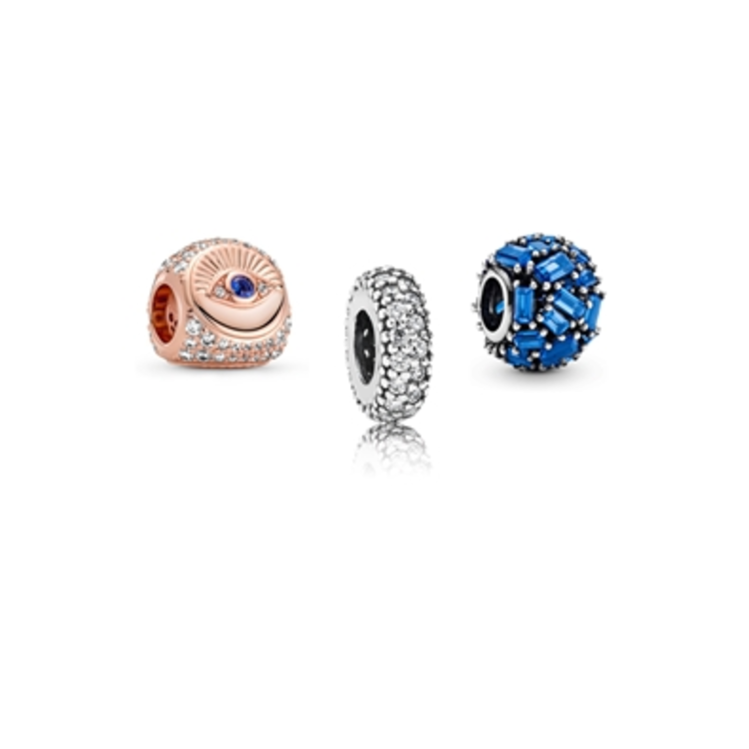 With the Protection Bundle, go everywhere with the knowledge you are protected. This bundle features an All Seeing Eye charm with vibrant blue center and a white enamel feather on the opposite side with a rose gold hue all over. There is also a vivid blue mosaic charm with different shaped stones that add texture and color to your look. You'll also get a spacer that adds a bit of sparkle to your bracelet. Start your Pandora story with this set or add the chapter to your story with the Protection Bundle.