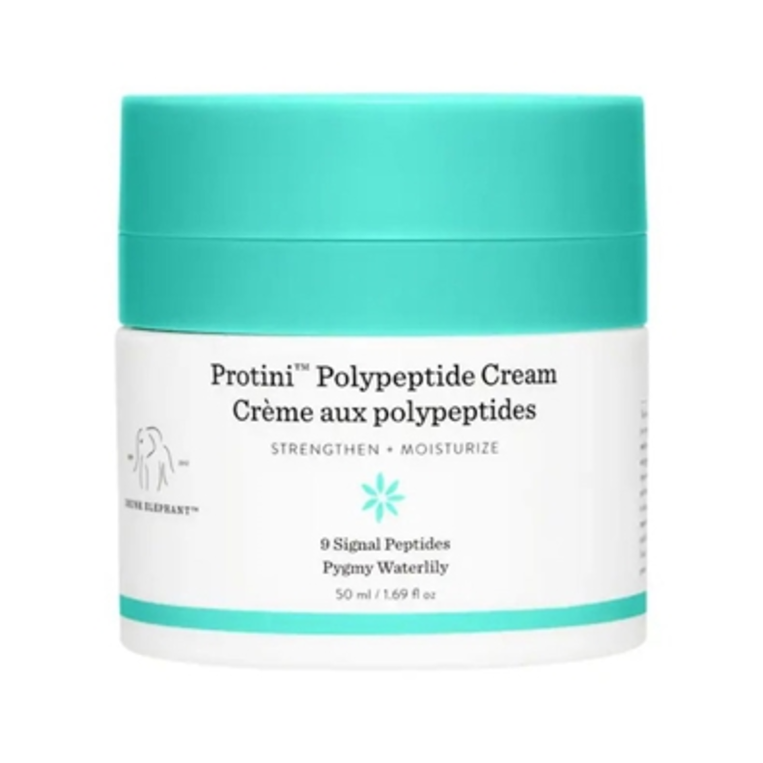 Drunk Elephant's Protini Polypeptide Firming Moisturizer combines signal peptides, growth factors, supportive amino acids, and pygmy waterlily for immediate improvement in the appearance of skin's tone, texture, and firmness. This product delivers daily moisture in a lightweight gel-cream. Visibly firms skin and supports healthy collagen production, restoring bounce. Reduces the appearance of texture, fine lines, wrinkles, and sun damage.Formulated at a skin-friendly pH of 4.0 and 100% free of essential oils, silicones, fragrance/dyes, and solvent alcohols. Apply morning and night to a clean, dry face. Use daily or in rotation with other Drunk Elephant moisturizers.