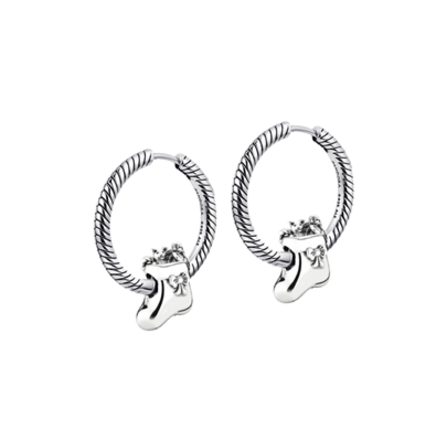 Create an instantly iconic look with the Pandora Moments Charm Hoop Earrings. These sterling silver earrings feature Pandora's famous snake chain pattern. Each hoop is the same size as a small Pandora O Pendant, meaning they can hold up to three charms or dangles like the stocking charm, hand finished and crafted from sterling silver with adorable detailing, filled with the most adorable presents. Wear them for a festive vibe or take the stockings off to wear these hoops as a sleek silhouette-or replace with your other Pandora favorites each day!