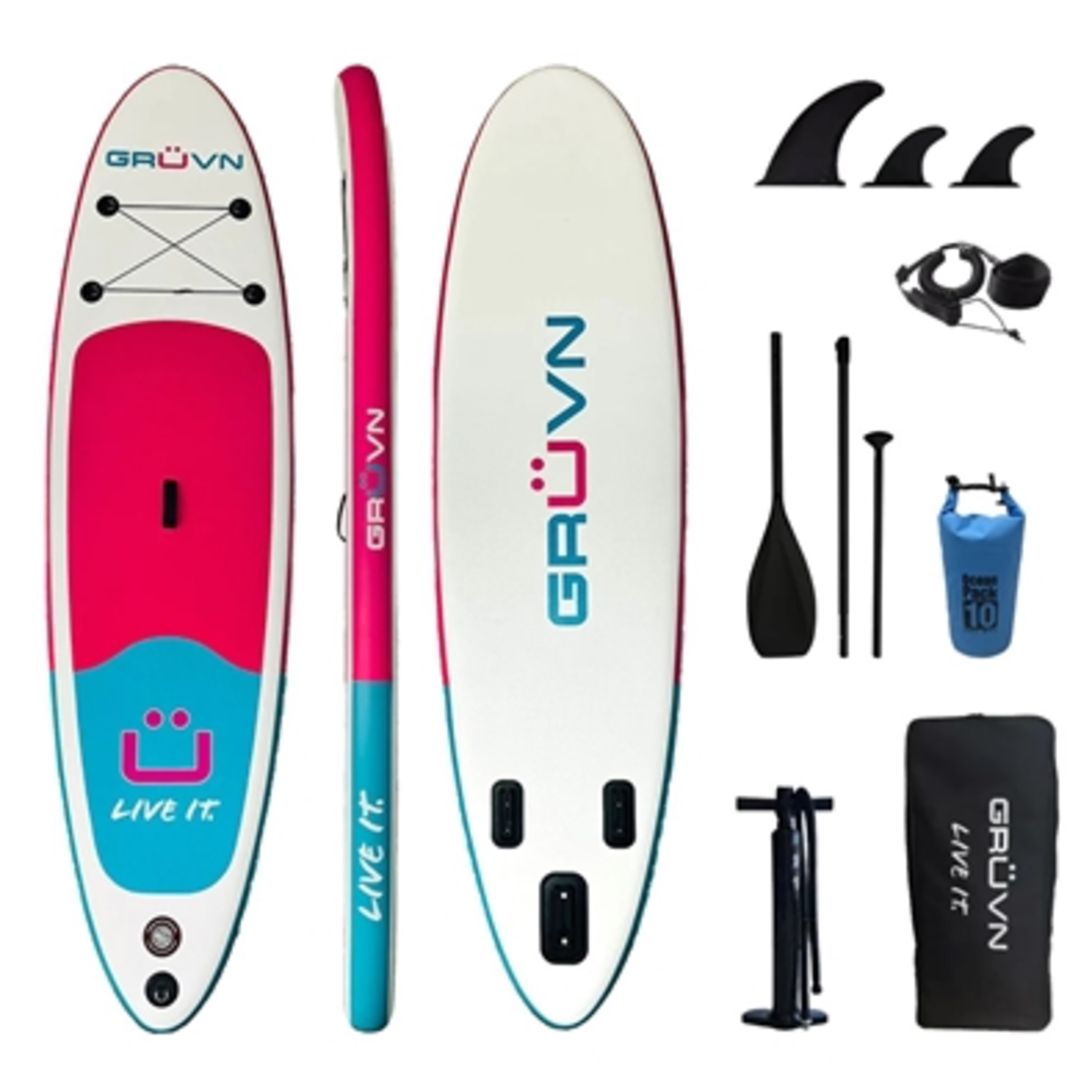 The GRUVN 10'6" all around inflatable paddle board is designed for the paddler who is interested in a variety of paddle boarding activities. Whether you're cruising a lake, into recreational touring or surfing, this versatile, wide width SUP provides all the stability and comfort you need. This board is made from the best A-Class High Density drop-stitch construction and is lightweight, stiff, and reliable. The board can be inflated or deflated quickly for easy storage, and you can take it where you go with the carrying backpack provided in the package. Both beginner and advanced riders looking for a paddle board with an all-around shape and a fresh look will love this inflatable paddle board. Package includes 1 GRUVN inflatable paddle board, 3-piece adjustable aluminum paddle, 3 fins (1 center fin + 2 side fins), 1 hand pump with pressure gauge (recommended pressure: 12 – 15 PSI),1 backpack, 1 leash and 1 repair kit.
