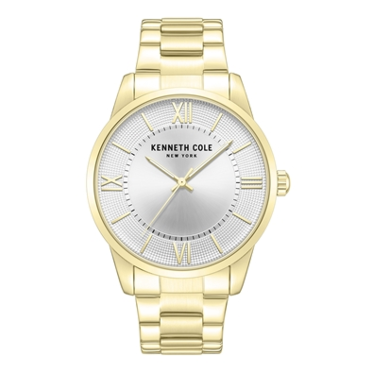 Kenneth Cole New York men's classic three hand watch has a gold-tone 44mm case. The silver dial accented with gold-tone indexes. The watch is complemented by a gold-tone stainless steel bracelet.