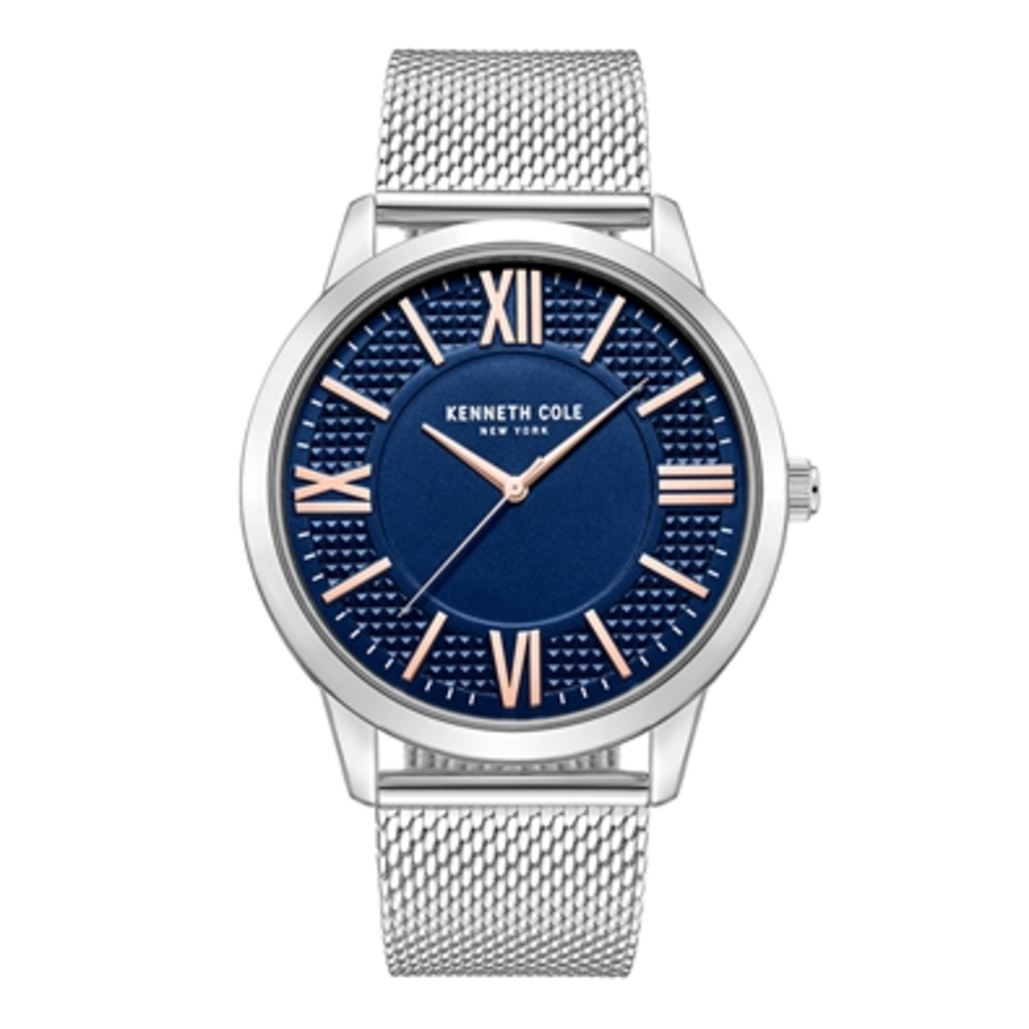 Kenneth Cole New York men's classic three hand watch has a silver-tone 44mm case. The textured blue dial accented with rose gold-tone indexes. The watch is complemented by a stainless steel mesh bracelet.