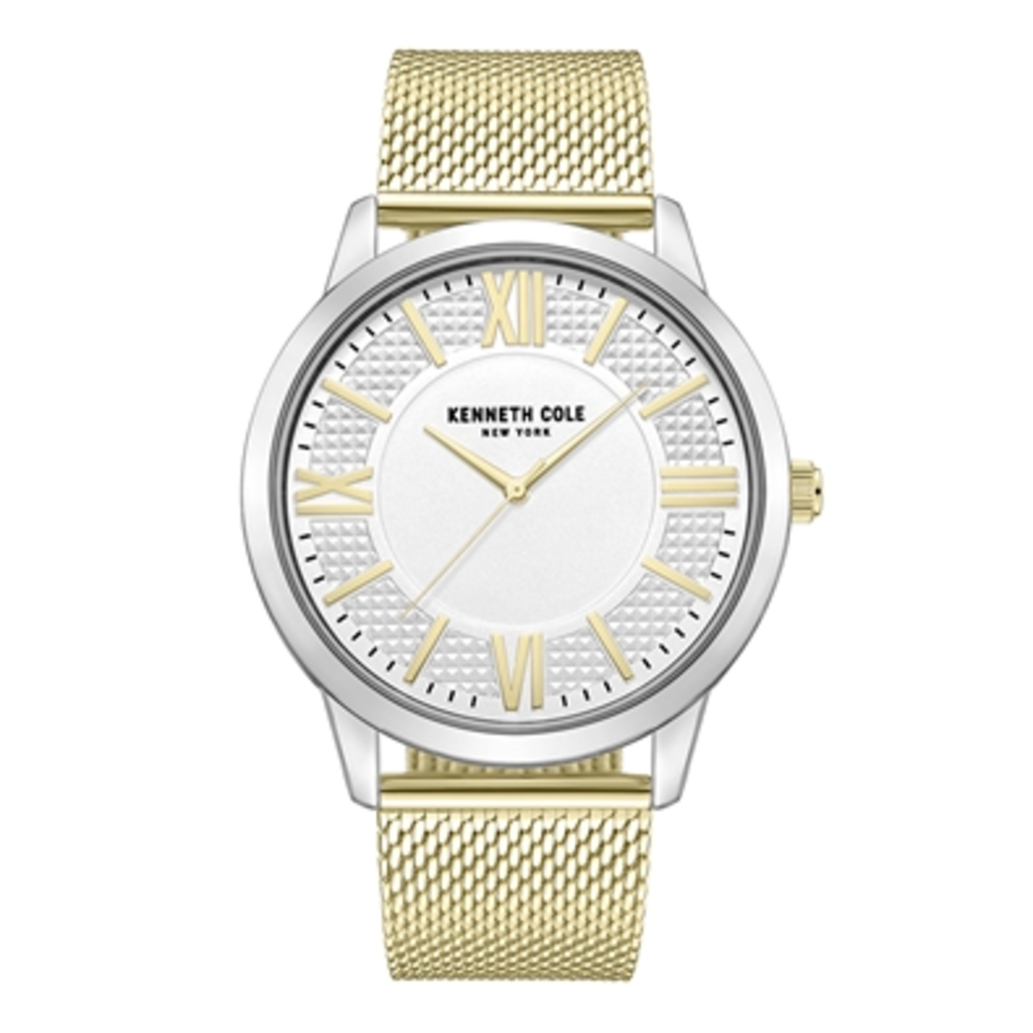 Kenneth Cole New York men's classic three hand watch has a silver-tone 44mm case. The textured white dial accented with gold-tone indexes. The watch is complemented by a gold-tone stainless steel mesh strap.