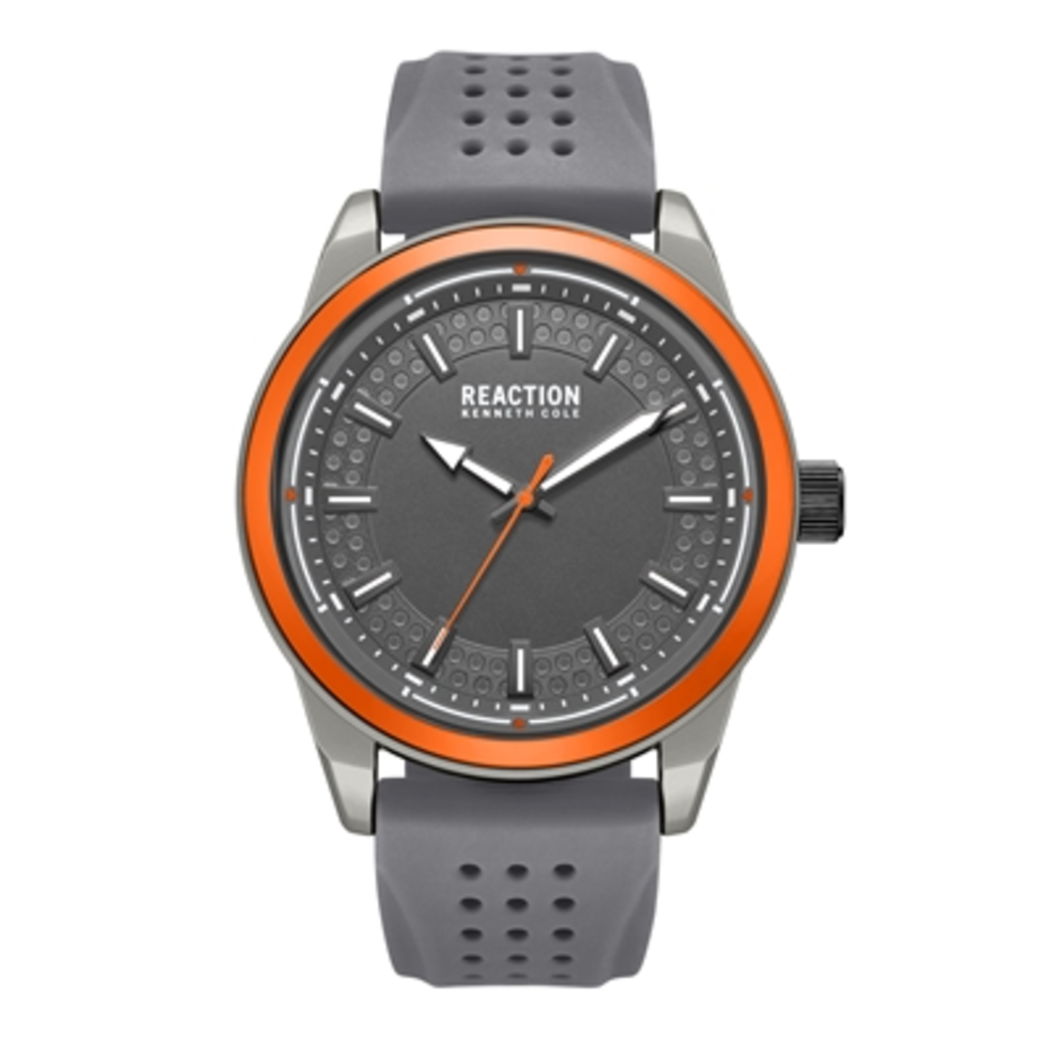 Kenneth Cole Reaction men's three-hand quartz analog watch features a two-tone gun metal and orange 48mm case. The grey dial is accented with an orange bezel. The watch is completed with a grey silicone strap.