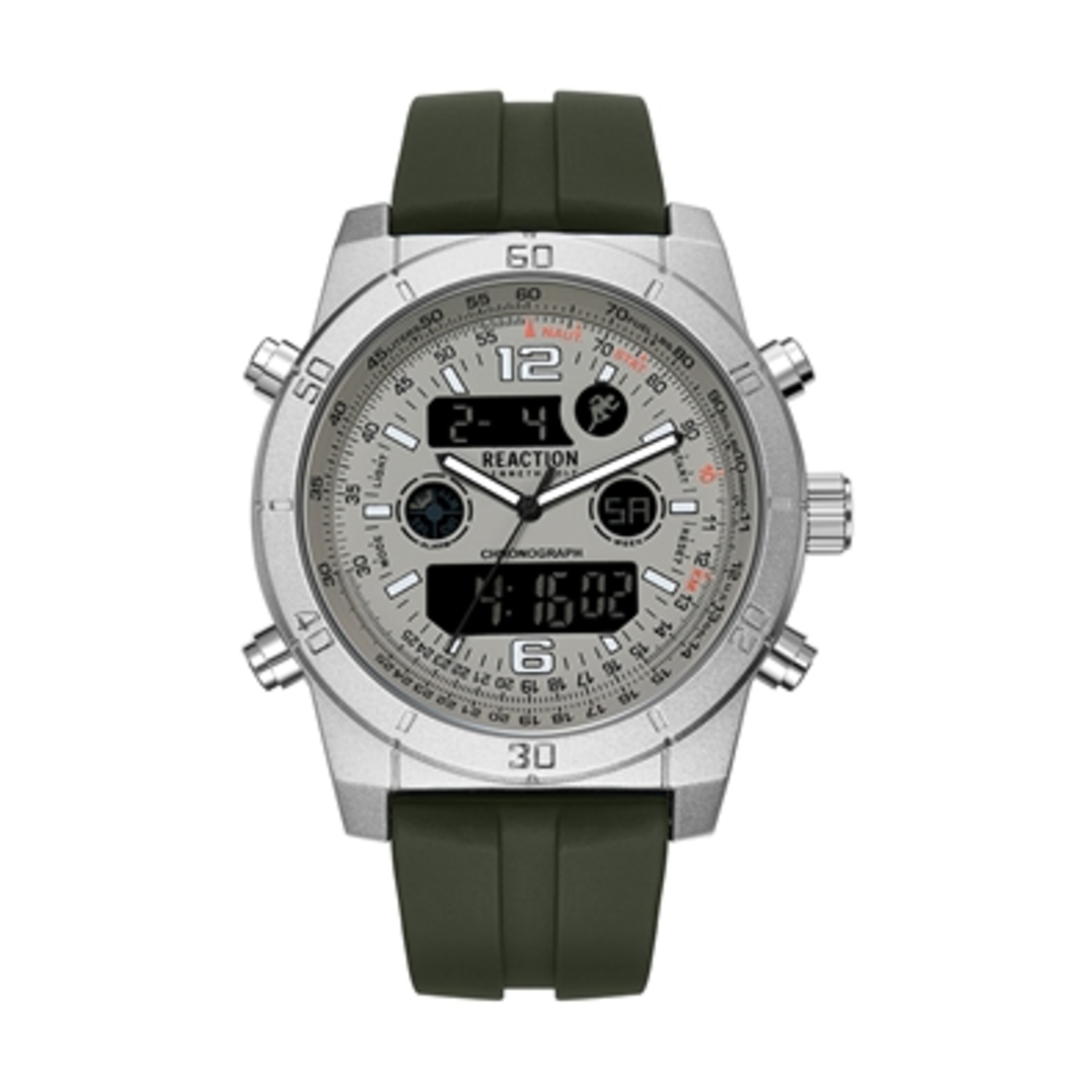Kenneth Cole Reaction men's watch features an analog and LCD digital movement. The silver 48mm case features a grey dial with five digital windows. The dial is accented with black indexes and completed with a green silicone strap.