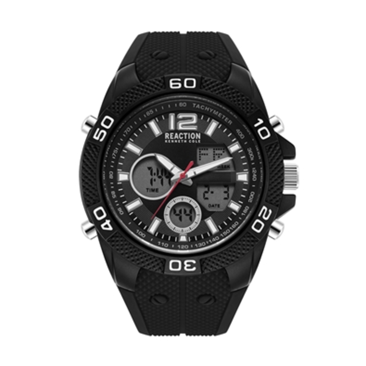 Kenneth Cole Reaction men's watch features an analog and LCD digital movement. The black 48mm case features a black dial with four digital windows. The dial is accented with gun metal indexes and completed with a black silicone strap.