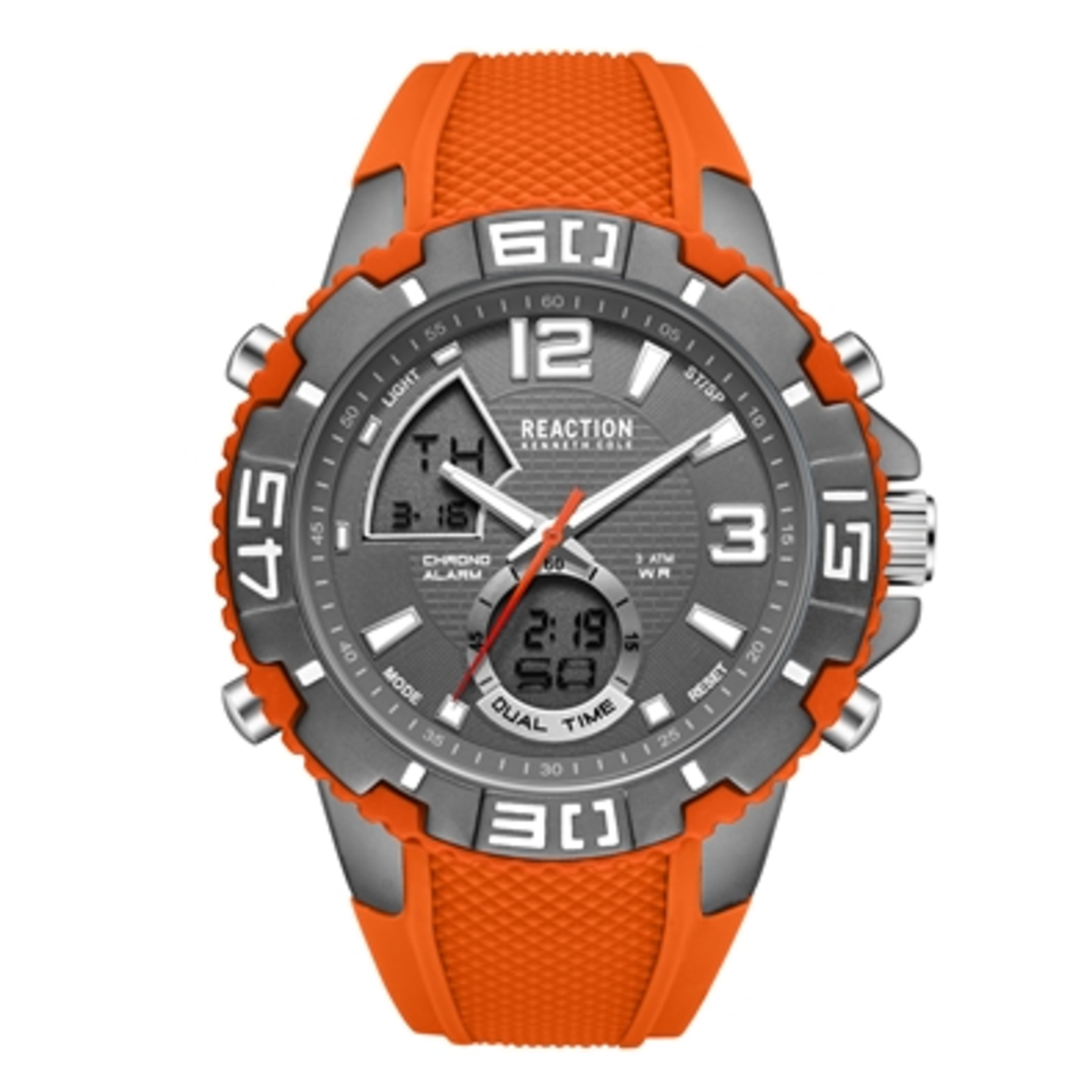 Kenneth Cole Reaction men's analog and digital watch features a gun metal-tone 49mm case with a sporty bezel. The orange dial is accented with two digital displays each with their own functionality. The watch is completed with a textured orange silicone strap.