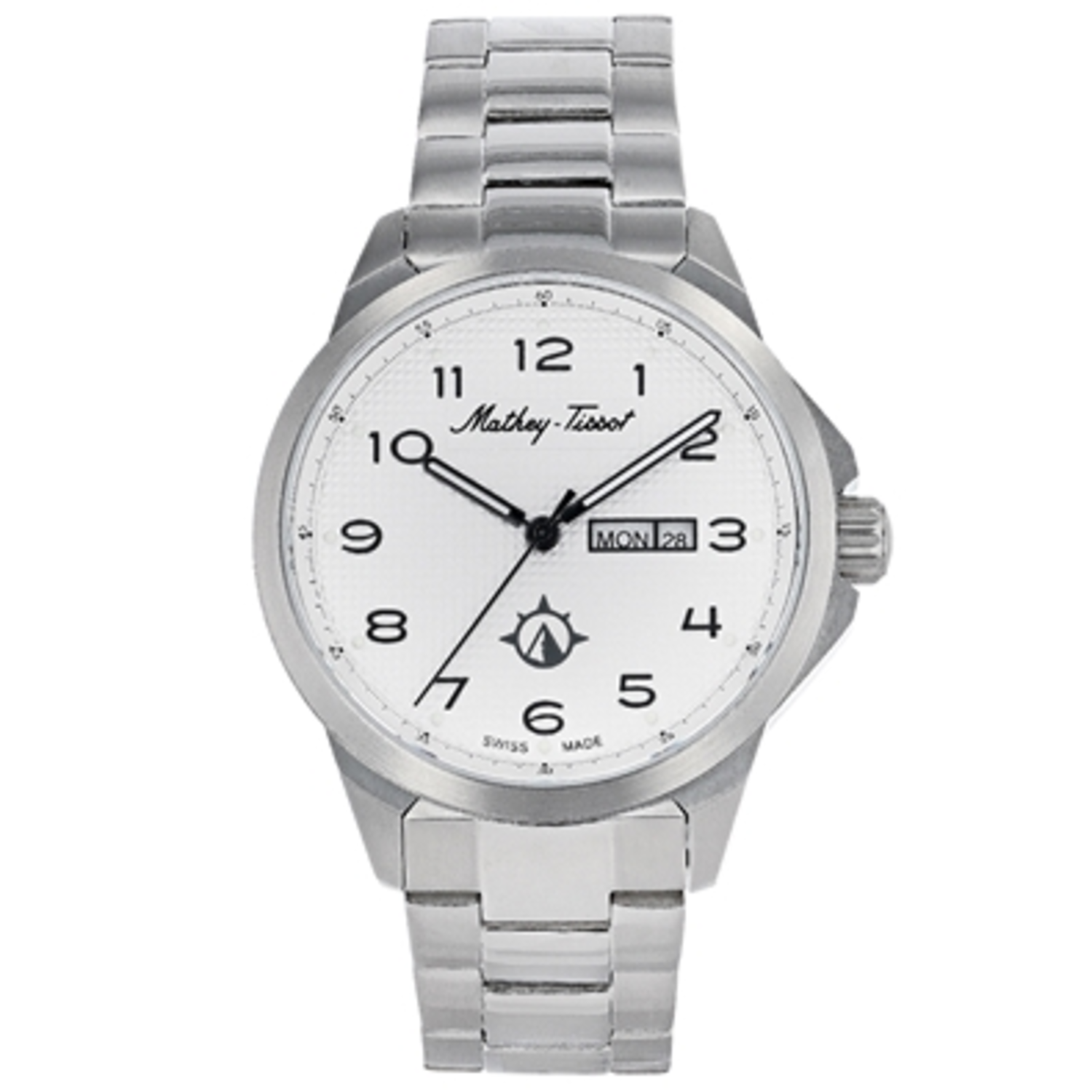 Since 1886, Swiss watch brand Mathey Tissot has produced prestigious time pieces known for their quality and craftsmanship. The Excalibur collection watch features a 45mm silver stainless steel case. The white textured dial is accented with a day date window with options for both English and French language. The watch is complemented a stainless steel bracelet.