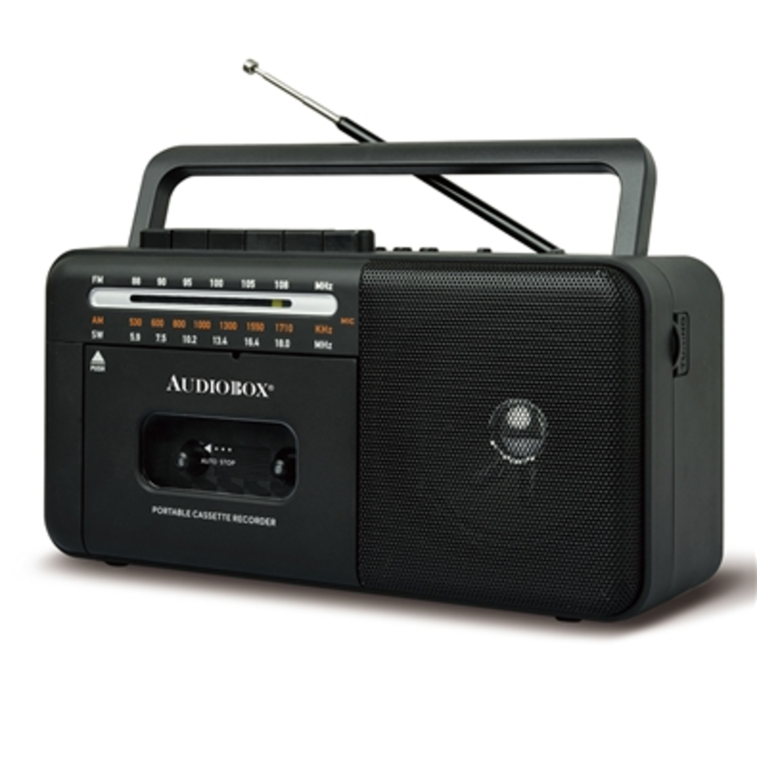 The Audiobox RXC-25BT is a versatile, retro-inspired boombox that combines classic design with modern functionality. It features a built-in cassette player and recorder with auto-stop, allowing you to play and record your favorite tapes. Additionally, it offers Bluetooth connectivity for wireless streaming, as well as AM, FM, and shortwave (SW) radio bands to keep you connected to a variety of stations. For digital music playback, the RXC-25BT supports MP3 files via USB and SD card slots. It also includes a 3.5mm headphone jack for private listening. The boombox is powered by an AC adapter or 4 D-cell batteries, providing flexibility for both home and portable use. Its compact design and built-in carry handle make it easy to take on the go. Whether you're reliving the past with your cassette collection or enjoying modern digital music, the Audiobox RXC-25BT offers a nostalgic yet contemporary audio experience.