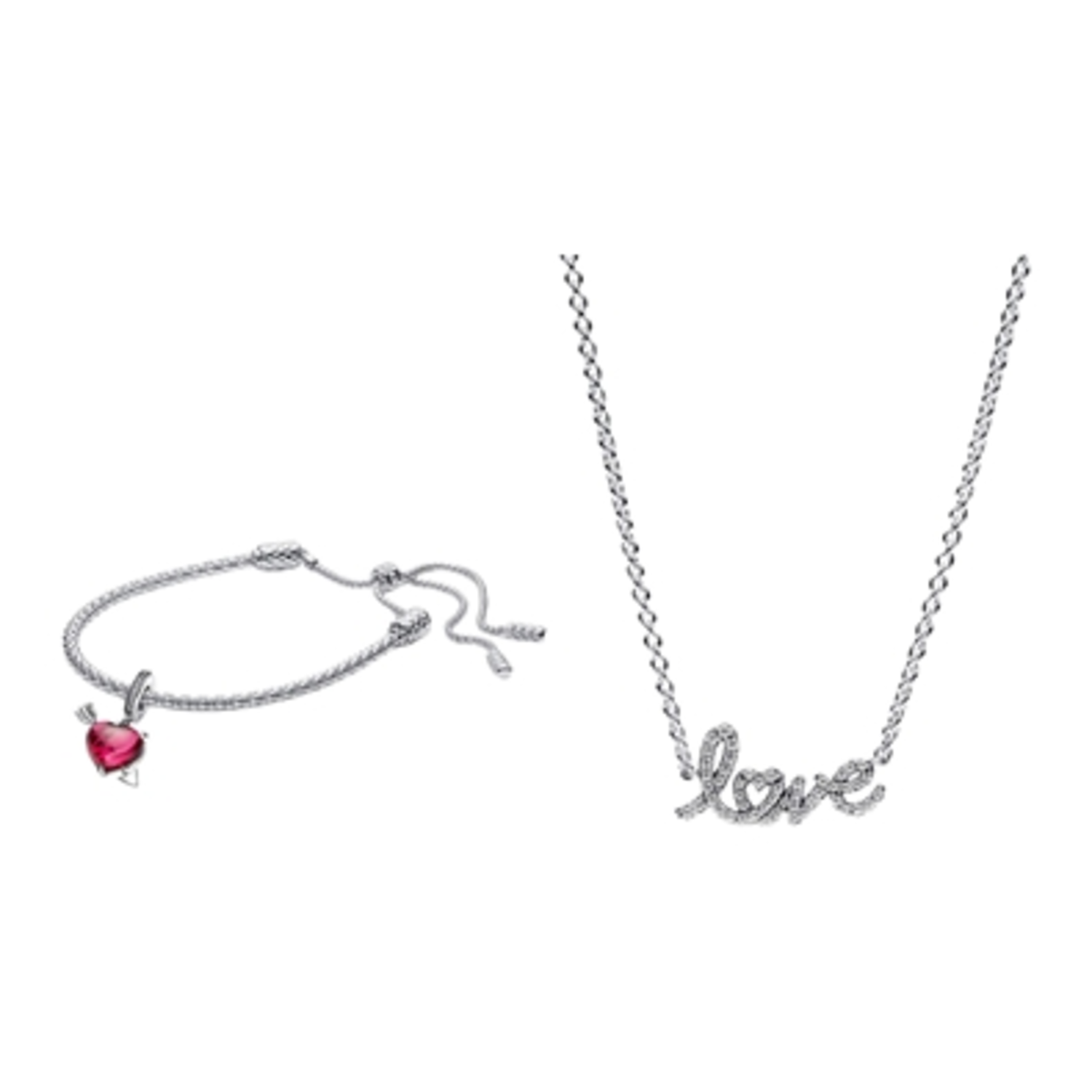 Spread some love every day...even if it's only to your jewelry box. This set features a silver necklace with a fixed pendant shaped like the word “love” in a handwritten style, adorned with sparkling cubic zirconia pavé. The letter "o" is shaped like a heart for a playful touch. The chain is adjustable to three lengths and has a tiny openwork heart dangle near the clasp. The bracelet is the iconic Studded Chain, reimagined. Move the slider to adjust the bracelet for a perfect fit - silicone on the inside keeps it in place. Functional end caps click open to add your charms, and smaller decorative end caps finish the ends of the chain. The reflective studded pattern continues throughout the chain and end caps for a camouflage effect. You can style this sterling silver bracelet with up to 10 charms or dangle charm. You can start your Pandora story with the red Heart and arrow murano glass dangle charm: a red heart crafted from Murano glass, struck by a sterling silver Cupid's arrow. The arrow spells out the word “love” through the glass, with the "o" forming a heart shape for a playful touch. A row of clear cubic zirconia pavé adds sparkle to the bail. The perfect way to start your Pandora story, you're gonna love this look!