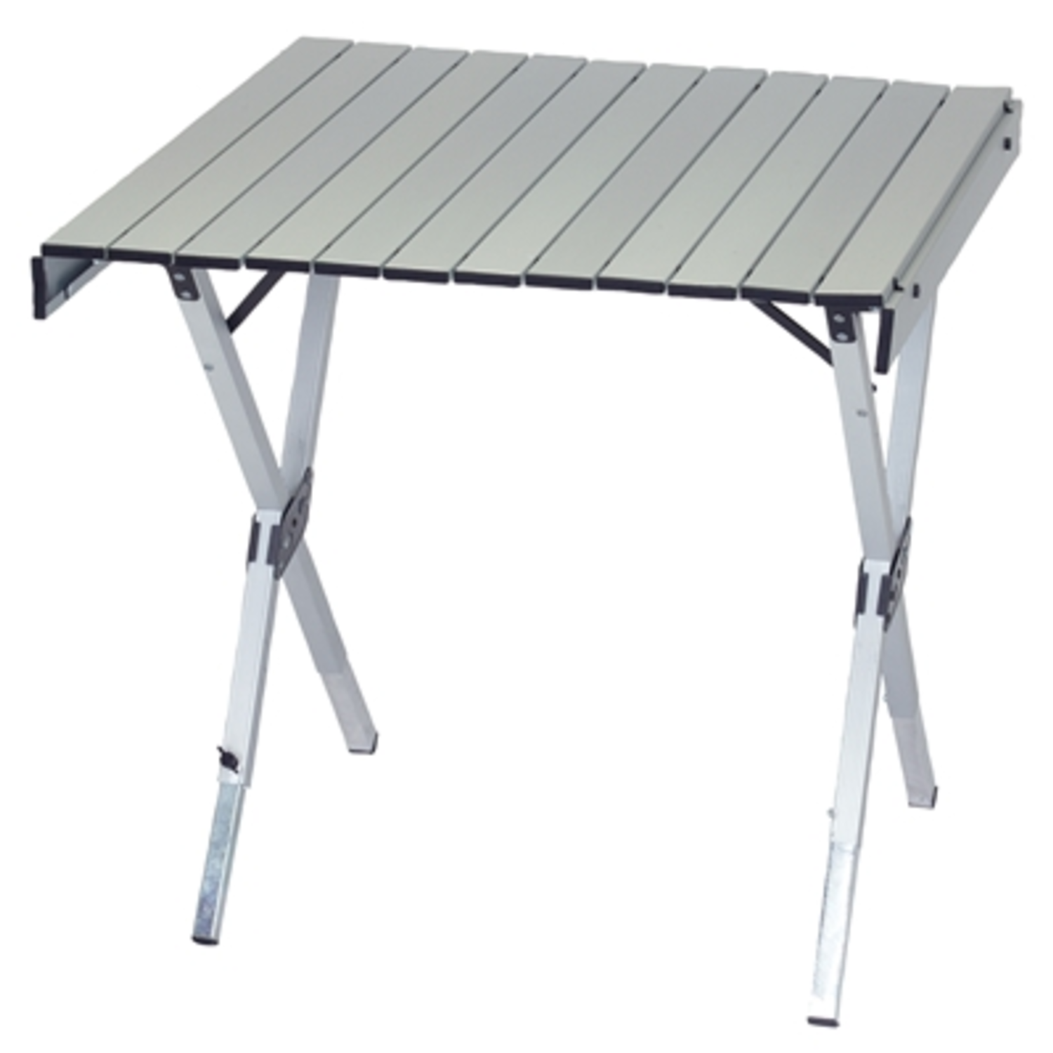 The Compact Expandable Roll Top Table features a telescoping aluminum frame which sets up in two table sizes. It adjusts for camp or standard height chairs using push-pin adjusters. The roll-top style table top is constructed of heat-dissipating aluminum. It also features the double-duty Close-It Hold-It Strap System. A telescoping table leg adjusts to uneven ground. Includes a zippered carry bag with handles for transport and storage. Ideal for camping, RV'ing and tailgating. steel frame and heat-dissipating roll-top aluminum table-top Portable and lightweight Includes zippered carry bag Weight capacity 60 lbs Open dimensions 28 to 48 inches x 27 x 27.5 inches Closed dimensions 30 x 11.5 x 4 inches
