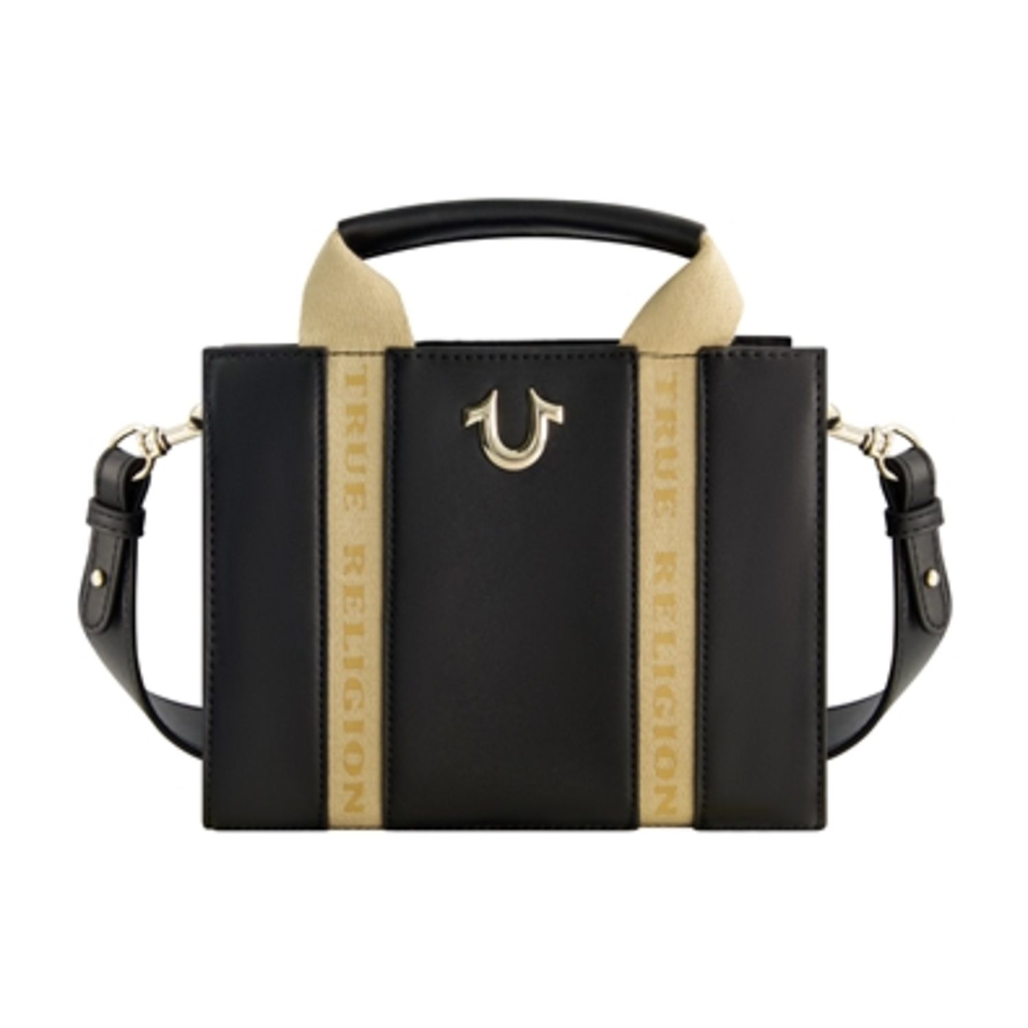Add a touch of luxury to your everyday style with the True Religion Licensed Faux Leather Mini Tote Bag. Crafted from premium faux leather, this sleek and structured tote features the iconic True Religion logo-branded cream canvas straps for a bold, signature look. The minimalist design blends fashion and function, offering dual top handles and an adjustable, detachable shoulder strap for versatile carrying options. The zippered main compartment opens to reveal a spacious interior with a back wall slip pocket to secure your essentials. Finished with a small metallic horseshoe logo and subtle branding, this bag is the ultimate blend of sophistication and practicality, perfect for any occasion. Officially licensed, it measures 6.5"H x 8.5"W x 3"D and weighs 1 lb. Imported.