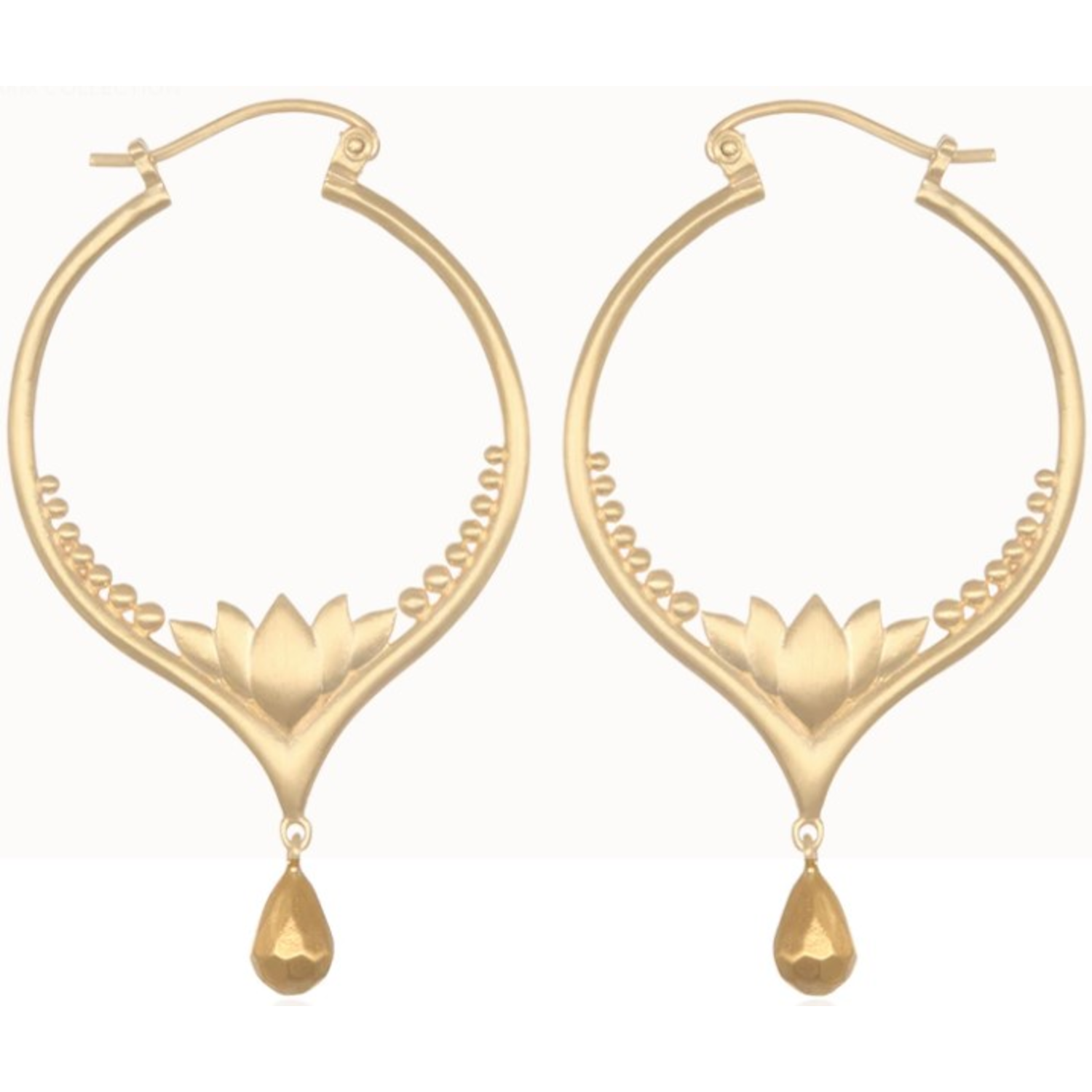 Begin your brilliant new chapter; you are ready to bloom to your full potential. Lotus flowers - symbol of new beginnings and full potential - nestle into the base of these 18k gold plate hoop earrings; a golden teardrop dangles delicately to catch the light with each turn of the head.
