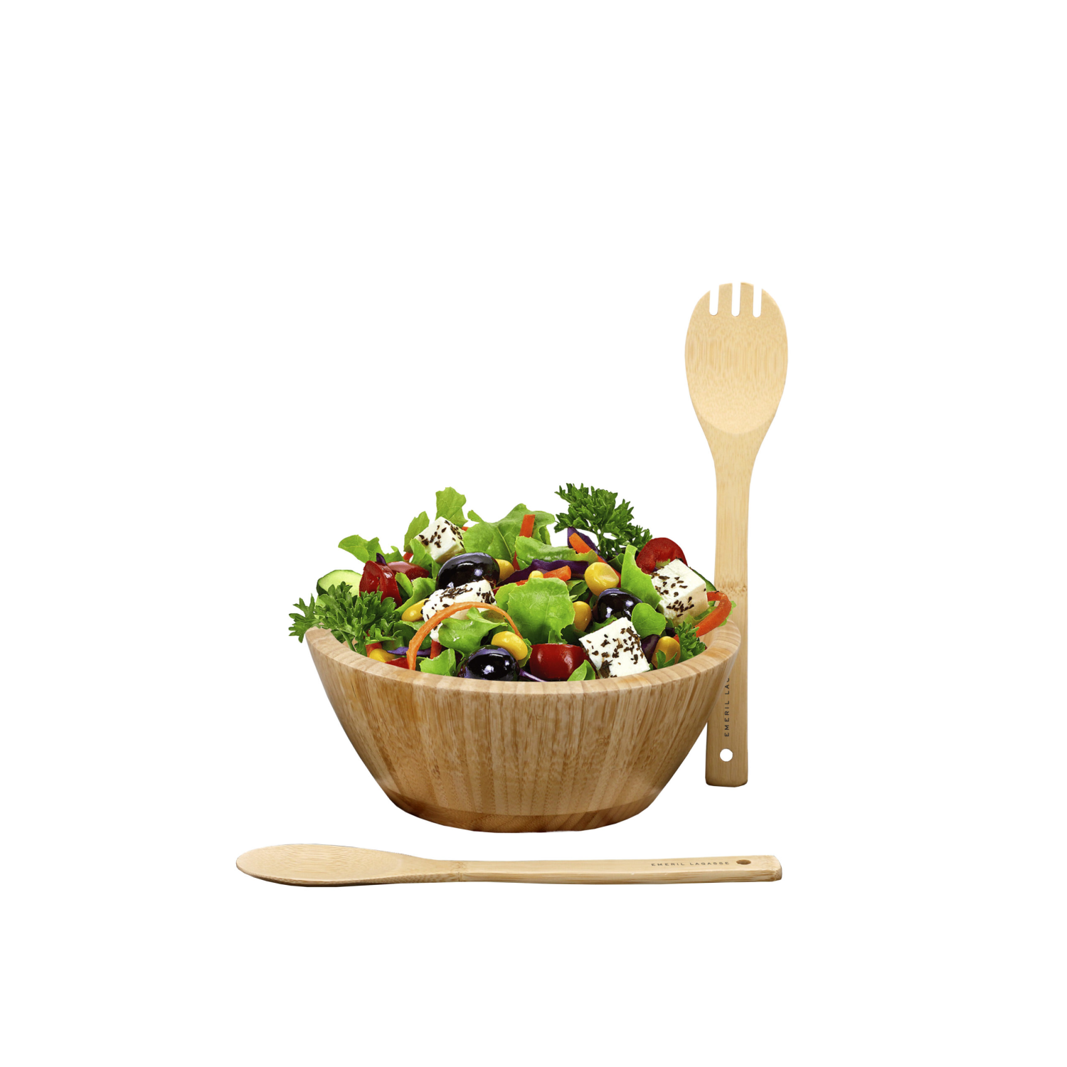 The emeril lagasse 3 pc large bamboo salad bowl with bamboo spoon and fork is the perfect bowl for those large family lunches and dinners. Bamboo plates and bowls are BPA (an industrial chemical often used to make plastics) and toxin-free, which means they won’t be leaching harmful materials into your foods. Bamboo is a high-quality material that is really strong, giving it a long and usable lifespan.